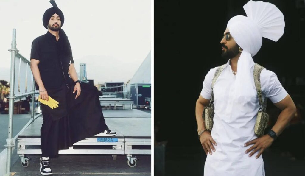 He came in two outfits, both black and white. Kurtas with a tamba and a turban, clean, rooted, and all his own. Diljit was showing off his Punjabi identity in this way.
