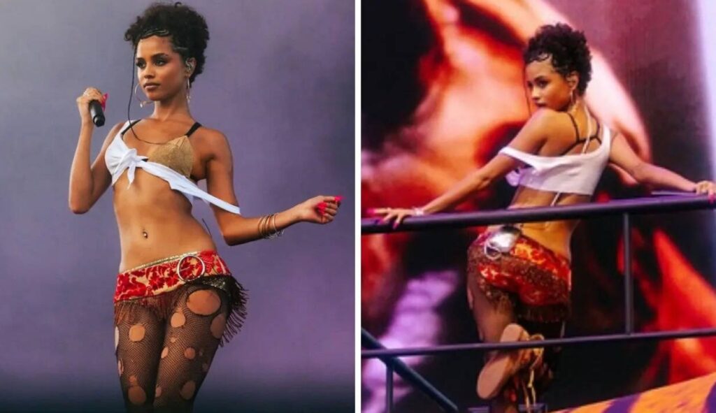 Tyla’s first look at Coachella 2025 was a vintage Dolce & Gabbana dress from their Spring 2000 ready-to-wear collection. She wore it with fringed micro denim shorts, which took everyone back to the Y2K era.